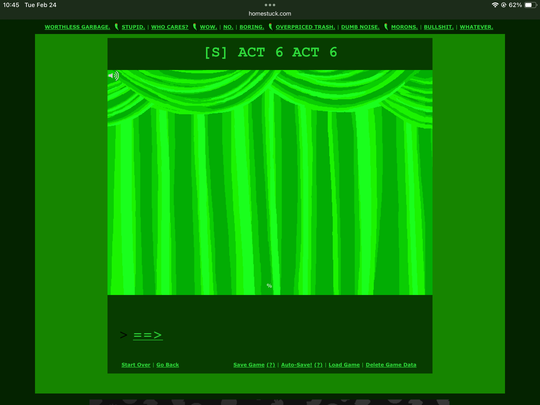I've made it to A6A5 in Homestuck. I am honestly getting a bit tired & burnt out of Homestuck but A6I4 was pretty funny. I had a good laugh at "[!!!] A6I4 ==>". But when I went to the map & looked at the length of A6A5, it made me want to stop reading for the day. It just feels like the story isn't going anywhere honestly & it's turning me off from continuing. Hopefully I end up liking A6A5 & really the rest of Hometuck because I'm too far in to give up at this point.